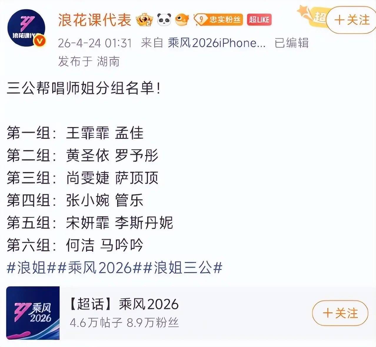 在这份名单中,12位帮唱姐姐被分成6个团,第二轮舞台公演淘汰2位姐姐后,29位姐姐进入下一轮舞台公演,也将被分为6个团。